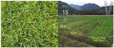 1.4 試驗(yàn)設(shè)計(jì):試驗(yàn)設(shè)畝愛(ài)秀100ml、150 ml,愛(ài)秀·氟吡氧乙酸混劑160 ml、145 ml、130 ml,愛(ài)秀100 ml+氟吡氧乙酸60 ml,驃100 ml+氟吡氧乙酸60 ml30L電動(dòng)噴霧器噴霧;愛(ài)秀·氟吡氧乙酸160 ml,愛(ài)秀100 ml+氟吡氧乙酸60 ml,驃100 ml+氟吡氧乙酸60 ml1.2L無(wú)人機(jī)飛防,以及清水空白對(duì)照11個(gè)處理。前8個(gè)噴霧處理(含CK),小區(qū)面積300,后3個(gè)飛防處理,每處理面積6-10畝。藥時(shí)間為2022年12月20日,麥苗生育期為3-4葉期。